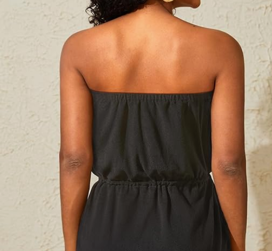 The strapless design of this cover-up offers a sleek, modern appearance that beautifully complements any swimsuit. The drawstring waist allows you to adjust the fit to suit your body shape, ensuring a comfortable and flattering silhouette. Whether you’re looking to transition seamlessly from the water to the lounge chair or need a stylish option for a casual summer day, this cover-up delivers both style and function.